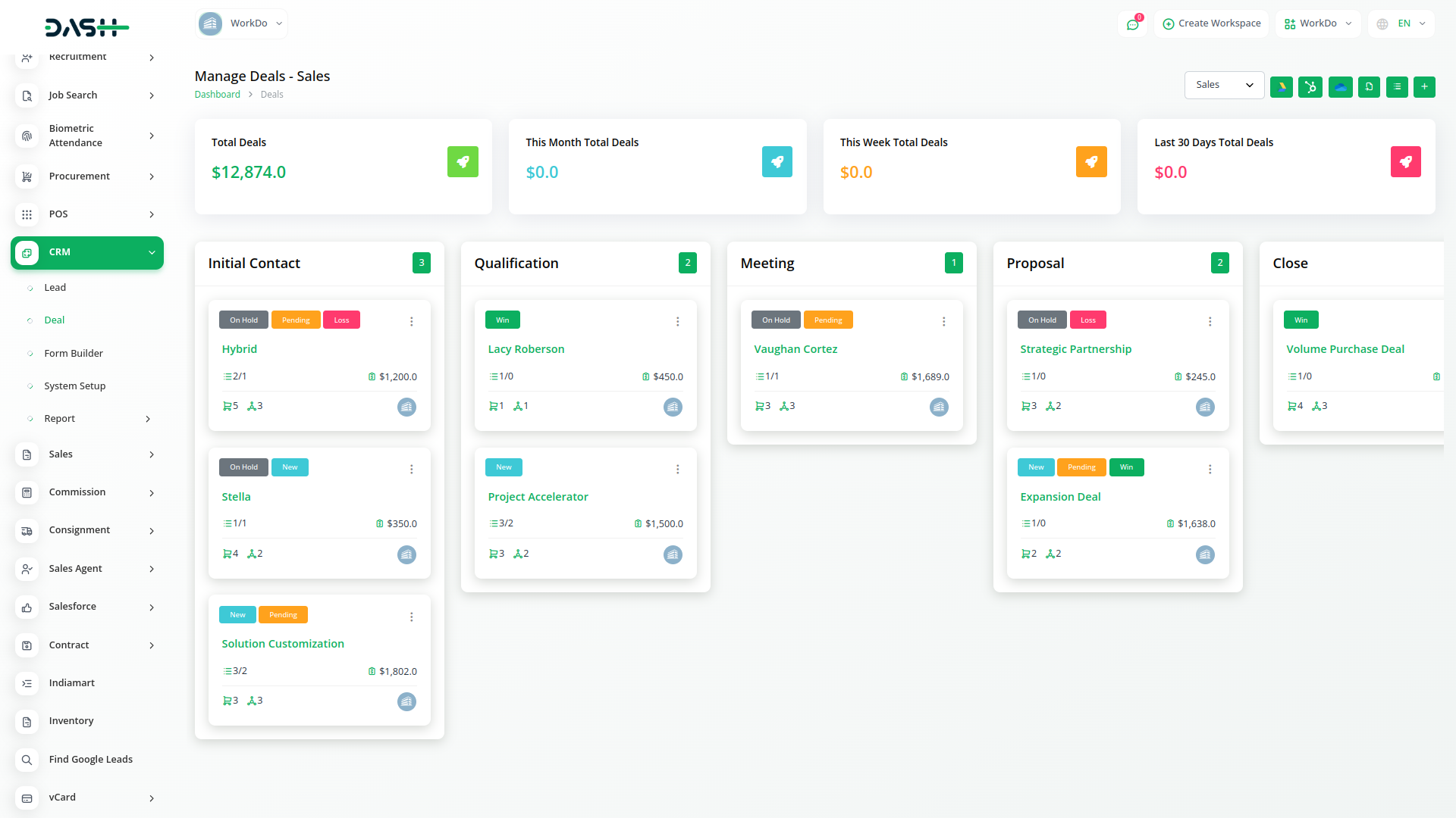 Get an actionable analysis of all your leads, deals, users, invoices, and products - in one interactive dashboard. Create and implement effective business plans, set a maximum number of deals, payment options and do so much more.